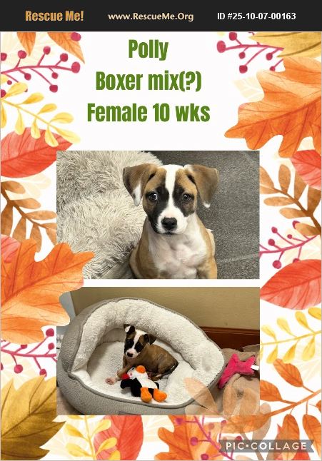 Polly is a female, 20 wks, mix breed. Possibly boxer mix. She is smart and and willing to learn. She will be a wonderful family pet.