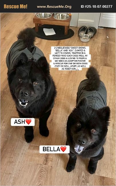 Courtesy Posting: Houston, TX (some transport may be available to qualified homes or fosters) HEARTBREAKING SITUATION, UNBELIEVABLY SWEET CHOWS 'BELLA' AND 'ASH' DUMPED AND LEFT TO STARVE, TRAPPED IN A FENCED YARD! EACH DOES WELL W/ OTHER DOGS and LOVING TO PEOPLE WHILE A GOOD SAMARITAN HAS SINCE GOTTEN THEM OUT OF THERE AND PROVIDED EMERGENCY MEDICAL, THEY CANNOT HOLD MUCH LONGER, NOR WANT TO BRING THEM TO HIGH KILL BARC SHELTER WHERE THEY WILL LIKELY BE KILLED. AN ADOPTER/FOSTER FOR ONE OR BOTH DOGS (THEY DO WELL APART, AS WELL AS TOGETHER) ARE NOW NEEDED, AS WELL AS PLEDGES TO ATTRACT A RESCUE, AND OR HELP PAY FOR BELLA'S EMERGENCY SURGERY SHE ALREADY HAD TO SAVE HER LIFE (GOOD SAM HAS TO PAY BILL) We were contacted by a good Samaritan on 9/1 after seeing a black chow caught in a fenced industrial yard without access to food or water, and in scorching summer heat. Food and water were brought, and after a week, the good Samaritan was able to secure the male who is described as 'very calm' and was fondly named 'Ash'. However, a second and much smaller black chow or chow mix was also there, but ran away. Again, the good sam returned to help, leaving food and water until this female chow could be secured. She has been fondly named 'Bella', is only 21 lbs and estimated by the vet to be 1 -2 years old. Ash is estimated to be be 3-5 years old and weighs 55 lbs. Sadly but not surprisingly, no owner came forward nor responded to or registered the chip. Given these chows would likely be euthanized in a very full and high kill BARC shelter, we are desperately looking for fosters for one or both to attract rescue interest, or better yet, an adopter for either or both. The good sam cannot hold the dogs much longer, but they are now both fixed and vaccinated, have run their stray holds, and thus can be rehomed or go to a rescue. Most rescues need a foster for one or both to help though. While continuing to look for a rescue over the past few weeks, please note little Bella became very ill and was rushed to the ER. She ended up having pyometra (a condition caused by lack of spaying that is fatal if not treated immediately) and had emergency surgery and hysterectomy to save her life. She is therefore now spayed and recovering thankfully well. Ash was found neutered previously. ��%BCThe vet bill is approximately $1500 so if there are any kind people would like to help pay for some of the medical already incurred, or can donate to a reputable rescue to help, please also let us know. Both dogs are good with one another, but did fine when separated and on their own while Bella was recovering from her surgery. They have also done well with a 5 lb female dog in the finder's home, as well when they see other dogs on walks. Bella has been in this home now for weeks and is described as 'loves being the center of attention. She takes to her owner. She is very loyal to her owner and the family. She does well walking in stores and out in parks or neighborhoods. She has to be properly introduced to new guest. Once she is introduced she stops huffing. Bella is a cuddle bug and wants all the attention. She gets along with other dogs but gets jealous if they get affection (with the exception of her brother Ash). (We are working on this). Bella has had pyometra surgery and has recovered well. Other than that she is very healthy and has a big appetite. Bella is potty trained and loves being indoors. She likes being outdoors for 1hr tops during the afternoons.' Ash has now been in this home a month and is also described as 'takes to his owner. He is very loyal to his owner and the family. He does well walking in stores and out in parks or neighborhoods. In his personal space (home) he tends to guard more so he does bark when looking out the window and he has to be properly introduced to new guest. Once he is introduced he stops huffing and won't bark at them. His bark is loud but he's just protecting his space and family. He has hotspots. He tends to be stubborn and very independent but listens to his owner and reassuring safety while in vet offices does help calm him down. He has recently been prescribed medicine to help calm him before a vet visit and possibly help for grooming sessions. Ash is potty trained and likes being indoors with freedom to go in and out. Avoid leaving him out during hot days.' Most importantly, both dogs need a loving, patient and forever home for each or both that they so deserve, or a foster and or rescue asap given the good Samaritan cannot hold much longer. If you are interested in learning more about Bella and or Ash to adopt or foster, or would like to contribute to their care or rescue, please contact [email protected] at Southern California Chow Chow Rescue Network who is trying to assist in this heartbreaking situation. Joint post is: https://www.facebook.com/debbie.alder.14/posts/pfbid04iTfg6V5Bjgfq4iu1choMTYU94t29caxHsdwqKqUC5QLHJ65MQyFLJ15Pp5oc3fJl