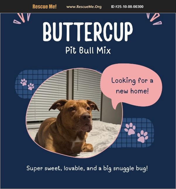 Buttercup is a 9-year-old Pit Bull mix who's been part of our family since she was a puppy. Over the years, she's been shared between loved ones, and now she's with me. Unfortunately, due to frequent travel and other dogs in my home who don't get along with her, I'm looking for a new, loving place for her to settle down for good. Despite her age, Buttercup is full of life, you'd never guess she's nine! She loves to play, snuggle on the couch, and stay close to her people. She's great with kids and does well with most dogs, though she's not a fan of cats. Her ideal home would be one where she can get plenty of attention, affection, and care. She's up to date on her rabies vaccine but will need someone who can keep up with routine vet visits. Buttercup is a very sweet, loyal girl who just wants to love and be loved in return. She deserves a forever home where she can thrive. Serious inquiries only!