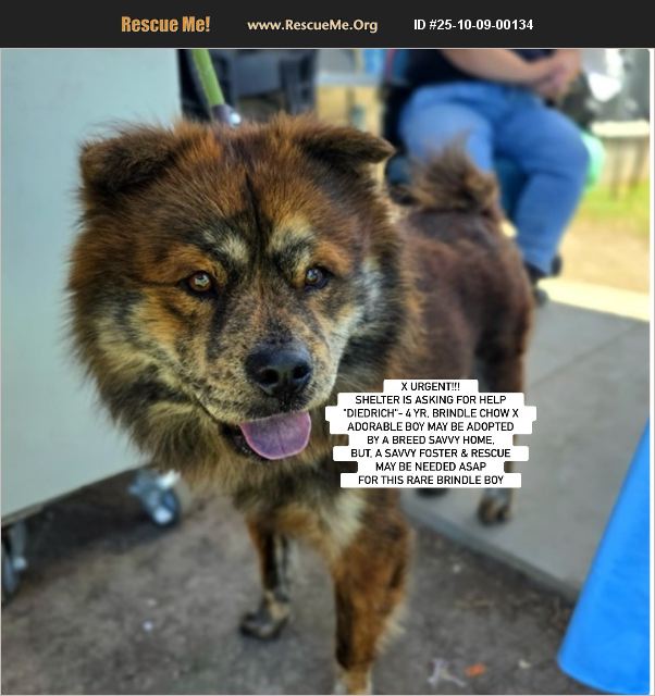 Courtesy Posting: LONG BEACH, CA (S CAL) - LONG BEACH ANIMAL CARE SERVICES - 'DIEDRICH'- ID #A749964 - 4 YR BRINDLE CHOW X ADORABLE BOY X URGENT, SHELTER IS ASKING FOR HELP MAY BE ADOPTED BY A BREED SAVVY HOME, BUT A SAVVY FOSTER & RESCUE MAY BE NEEDED ASAP FOR THIS RARE BRINDLE BOY Please help us find a loving home or foster (or foster to adopt) and/or rescue asap for this handsome stunner the Long Beach shelter fondly named 'Diedrich'. Found as a stray, the shelter says, 'Diedrich has been with us since the end of September, 2025. He would benefit from an adopter/rescue that is very familiar with the breed as Chow Chows are known to be independent, aloof, and take time to warm up to new people. In the shelter, Diedrich has been apprehensive to approach people (stiff body posture, growls, and gives whale-eye). He is available for immediate adoption or rescue pull.' Diedrich has since had a third behavior evaluation on 10/8 and the shelter let us know, 'the most recent behavior review does show significant improvement in behavior with no instances of growling or retreating to back of kennel on approach. A749964 still presents himself slightly aloof with interactions from handlers, but accepts attention and is displaying a more curious behavior with general interest to interact with staff/volunteers.' Breed savvy Adopters should contact the shelter directly at (562) 570-3080 and ask for Diedrich by his ID. His listing link is https://24Petconnect.com/DetailsMain/LONG/A749964 If you can foster locally, please also contact the shelter to see if this may work. If not, or further away, and interested in fostering, or fostering to adopt, please contact [email protected] or Southern California Chow Chow Rescue Network who is trying to assist the shelter with his placement. Most Rescue groups need a foster to save. Additional Videos, pictures and updates will be posted on facebook at: https://www.facebook.com/debbie.alder.14/posts/pfbid02unaunJemWjregVd9zDbVudzjActn51ci5yv8dBonaczLQbpxE4Y7REgiwTgjrr6Jl Note: to view contents of links you will need to copy and paste each one separately into your browser.