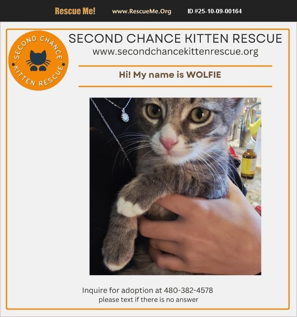 Meet WOLFIE - Curious eyes and playful stride, Wolfie's joy is hard to hide Hi, I'm Wolfie! I'm a kitten with a big heart and an adventurous spirit. I love exploring every nook and cranny of my surroundings, always curious about what's around the corner. Though I'm brave and independent, I also have a soft side. I'm quite the chatterbox and love sharing stories with anyone who'll listen. After a long day of play, there's nothing better than a good meal and some cuddles. I'm loyal and mellow, making me the perfect companion for quiet evenings. If you're looking for a playful, loving friend, I'm your guy. Let's make a home together! At Second Chance Kitten Rescue, our kittens grow up in a loving, home-like environment where they learn to play, build confidence, and connect with people. They enjoy supervised adventures around the house and fresh air in our outdoor catio, plus their very own bedroom filled with fun, stimulating toys. We spoil them with lots of love and socialization, including gentle introductions to both big and small dogs, so they're ready to thrive in their furever homes. We feed only the best, including Royal Canin Kitten as our main diet, along with premium wet foods like Weruva, Merrick, and Purina formulas-ensuring healthy growth and development. If you're looking for a healthy, well-cared-for kitten with top-notch vet care and a nurturing start, we'd love for you to visit us at Second Chance Kitten Rescue. For adoption details, please visit our website to review the process: https://secondchancekittenrescue.org/available-kitties Feel free to message us with questions after reviewing! Thanks for considering Second Chance Kitten Rescue! Second Chance Kitten Rescue PHOENIX, AZ [email protected] (480) 382-4578