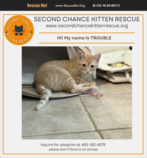 Meet TROUBLE is my name but LOVE is my game! This super handsome orange tabby is the definition of charm. Sweet as syrup and bursting with energy, he's a people-loving, snack-chasing, toy-pouncing little whirlwind who brings joy wherever he goes. Whether he's zooming through the house or curling up for cuddles, he's always ready to make you smile. He's been raised with love, socialized in a home environment, and knows how to play nicely with others. Bonus: he's got a healthy appetite and a heart full of affection. If you're looking for a kitten who's equal parts snugglebug and goofball, this boy is your guy. At Second Chance Kitten Rescue, our kittens grow up in a loving, home-like environment where they learn to play, build confidence, and connect with people. They enjoy supervised adventures around the house and fresh air in our outdoor catio, plus their very own bedroom filled with fun, stimulating toys. We spoil them with lots of love and socialization, including gentle introductions to both big and small dogs, so they're ready to thrive in their furever homes. We feed only the best, including Royal Canin Kitten as our main diet, along with premium wet foods like Weruva, Merrick, and Purina formulas-ensuring healthy growth and development. If you're looking for a healthy, well-cared-for kitten with top-notch vet care and a nurturing start, we'd love for you to visit us at Second Chance Kitten Rescue. How to Schedule a Weekend Meet and Greet If you would like to arrange a private, appointment-only meet and greet on a Saturday or Sunday, please follow these steps: 1. Visit www.secondchancekittenrescue.org. 2. Review the information under the 'Adoption Information' tab to become familiar with our process and expectations. 3. Complete and submit the Adoption Questionnaire. We will reach out to you within 24 to 48 hours to confirm your two-hour appointment for up to two people. During this visit, you will spend one on one time in our kitten room, interact with our rescue kittens, and see which kitten chooses you. --- Questions and Contact If you have any questions before or after completing the questionnaire, please feel free to email us at [email protected]. We look forward to meeting you and helping you find your new fur baby companion. Thanks for considering Second Chance Kitten Rescue! Warm regards, Lisa & Ariella