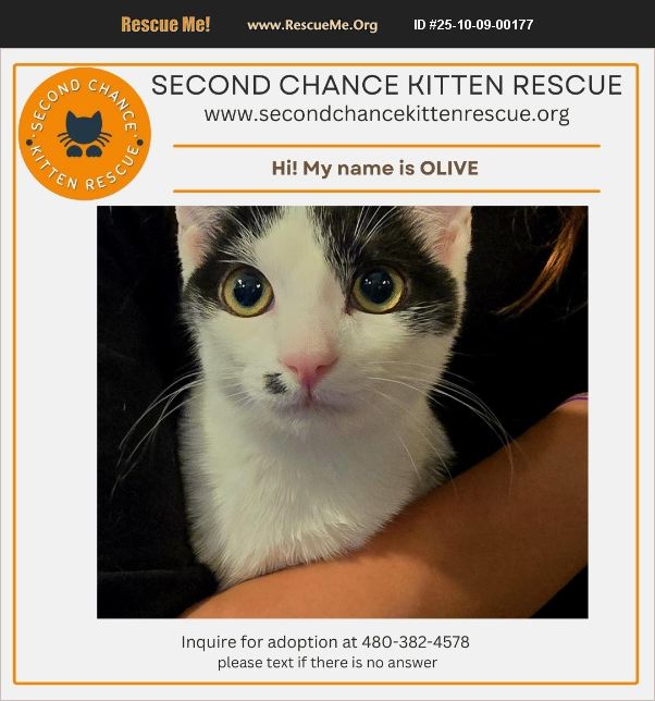 Meet OLIVE - Bonded with Red & Callie - Sweet and calm with eyes so wise, Olive's cuddles win the prize. Hi! I'm Cindy Crawford, ooops, I mean, Olive! I am a kitten with a heart full of love and paws ready to play. I adore exploring every nook of our cozy shelter with my siblings, Callie and Red. We have the best adventures together! I'm a bit shy at first, but give me a minute, and I'll be your loyal friend. I'm quite smart too; figuring out puzzles and games is my favorite! If you're looking for a brave, funny, and energetic companion, I'm your girl. Adopt me, and let's start our own fun-filled journey together! At Second Chance Kitten Rescue, our kittens grow up in a loving, home-like environment where they learn to play, build confidence, and connect with people. They enjoy supervised adventures around the house and fresh air in our outdoor catio, plus their very own bedroom filled with fun, stimulating toys. We spoil them with lots of love and socialization, including gentle introductions to both big and small dogs, so they're ready to thrive in their furever homes. We feed only the best, including Royal Canin Kitten as our main diet, along with premium wet foods like Weruva, Merrick, and Purina formulas-ensuring healthy growth and development. If you're looking for a healthy, well-cared-for kitten with top-notch vet care and a nurturing start, we'd love for you to visit us at Second Chance Kitten Rescue. For adoption details, please visit our website to review the process: https://secondchancekittenrescue.org/available-kitties Feel free to message us with questions after reviewing! Thanks for considering Second Chance Kitten Rescue!