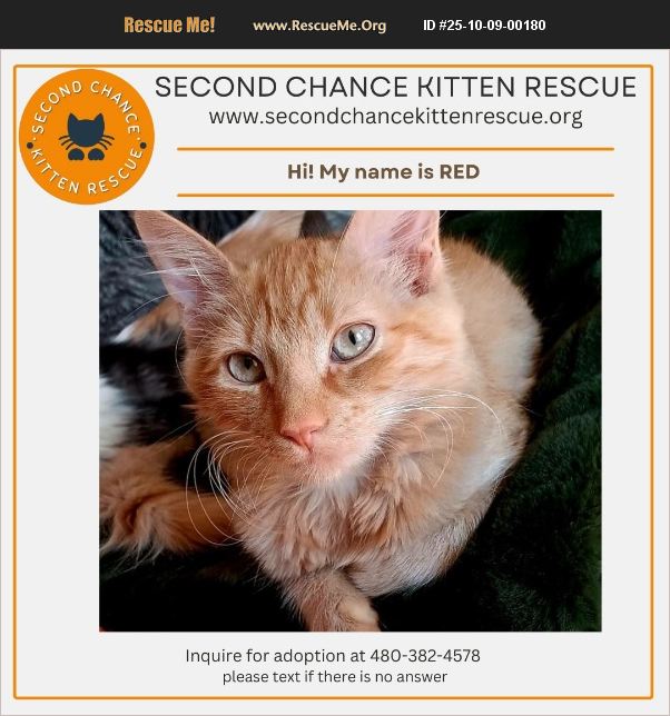 Meet RED - Bonded with Callie & Olive - Bold and brave with playful flair, Red's the spark that fills the Hi! I'm Red, the superhero kitten. My adventure began when my sisters, Olive and Callie, and I discovered a hidden maze behind our old home. Curious and brave, we ventured in, solving puzzles and dodging tricky traps with our clever paws. It was all fun until we realized we were lost! Luckily, a kind human found us and brought us here, to the SCKR, where we continue our playful training, waiting for our next big mission. I'm a loyal friend, always ready for a cuddle or a playful chase. Adopt me for a life filled with adventure and love! At Second Chance Kitten Rescue, our kittens grow up in a loving, home-like environment where they learn to play, build confidence, and connect with people. They enjoy supervised adventures around the house and fresh air in our outdoor catio, plus their very own bedroom filled with fun, stimulating toys. We spoil them with lots of love and socialization, including gentle introductions to both big and small dogs, so they're ready to thrive in their furever homes. We feed only the best, including Royal Canin Kitten as our main diet, along with premium wet foods like Weruva, Merrick, and Purina formulas-ensuring healthy growth and development. If you're looking for a healthy, well-cared-for kitten with top-notch vet care and a nurturing start, we'd love for you to visit us at Second Chance Kitten Rescue. For adoption details, please visit our website to review the process: https://secondchancekittenrescue.org/available-kitties