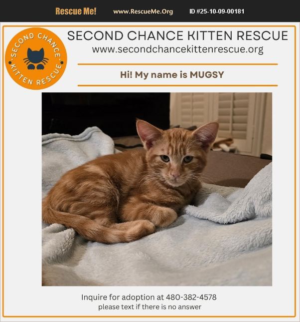 Meet MUGSY - Big on cuddles, small in size, Mugsy's love is the sweetest prize. Hi! I'm Mugsy, your future best friend. I love exploring every corner of my world, always curious about what's around. I'm quite the chatterbox too, always ready to tell you about my day. I'm independent but need a friend, but I cherish moments we share. Playing is my favorite - I could chase toys all day! I'm also a big foodie, who isn't? But when it's time to relax, watch out because I'll curl right up with you. Adopting me means endless love, laughter, and a loyal companion. Let's make memories together! At Second Chance Kitten Rescue, our kittens grow up in a loving, home-like environment where they learn to play, build confidence, and connect with people. They enjoy supervised adventures around the house and fresh air in our outdoor catio, plus their very own bedroom filled with fun, stimulating toys. We spoil them with lots of love and socialization, including gentle introductions to both big and small dogs, so they're ready to thrive in their furever homes. We feed only the best, including Royal Canin Kitten as our main diet, along with premium wet foods like Weruva, Merrick, and Purina formulas-ensuring healthy growth and development. If you're looking for a healthy, well-cared-for kitten with top-notch vet care and a nurturing start, we'd love for you to visit us at Second Chance Kitten Rescue. For adoption details, please visit our website to review the process: https://secondchancekittenrescue.org/available-kitties Feel free to message us with questions after reviewing! Thanks for considering Second Chance Kitten Rescue!