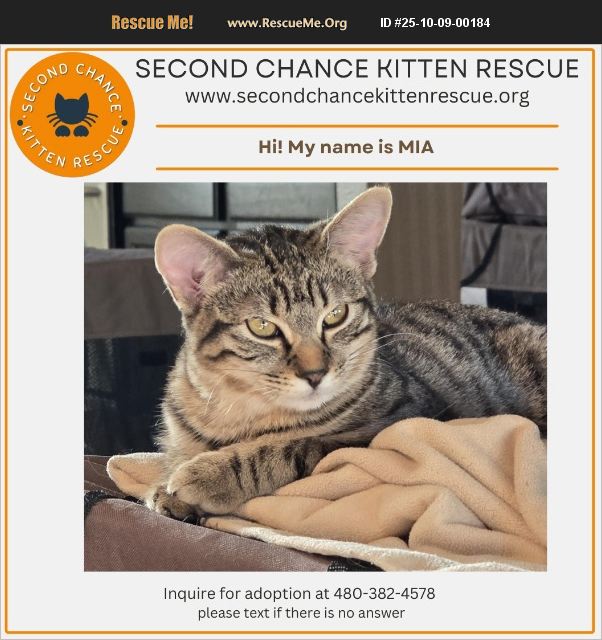 Meet MIA - Softest fur and gentle purr, Mia's love will surely stir. Hi! I'm Mia, a kitten with a heart full of love and paws ready to explore! Every day, I embark on new adventures around my shelter home, solving puzzles and chasing toys. I'm independent but adore company; I thrive on cuddles and playtime with friends. My curious eyes are always seeking out new sights and my playful spirit keeps everyone smiling. If you need a brave, loyal companion who promises to fill your days with joy and laughter, I'm here waiting for you. Let's start our journey together! At Second Chance Kitten Rescue, our kittens grow up in a loving, home-like environment where they learn to play, build confidence, and connect with people. They enjoy supervised adventures around the house and fresh air in our outdoor catio, plus their very own bedroom filled with fun, stimulating toys. We spoil them with lots of love and socialization, including gentle introductions to both big and small dogs, so they're ready to thrive in their furever homes. We feed only the best, including Royal Canin Kitten as our main diet, along with premium wet foods like Weruva, Merrick, and Purina formulas-ensuring healthy growth and development. If you're looking for a healthy, well-cared-for kitten with top-notch vet care and a nurturing start, we'd love for you to visit us at Second Chance Kitten Rescue. How to Schedule a Weekend Meet and Greet If you would like to arrange a private, appointment-only meet and greet on a Saturday or Sunday, please follow these steps: 1. Visit www.secondchancekittenrescue.org. 2. Review the information under the 'Adoption Information' tab to become familiar with our process and expectations. 3. Complete and submit the Adoption Questionnaire. We will reach out to you within 24 to 48 hours to confirm your two-hour appointment for up to two people. During this visit, you will spend one on one time in our kitten room, interact with our rescue kittens, and see which kitten chooses you. --- Questions and Contact If you have any questions before or after completing the questionnaire, please feel free to email us at [email protected]. We look forward to meeting you and helping you find your new fur baby companion. Thanks for considering Second Chance Kitten Rescue! Warm regards, Lisa & Ariella