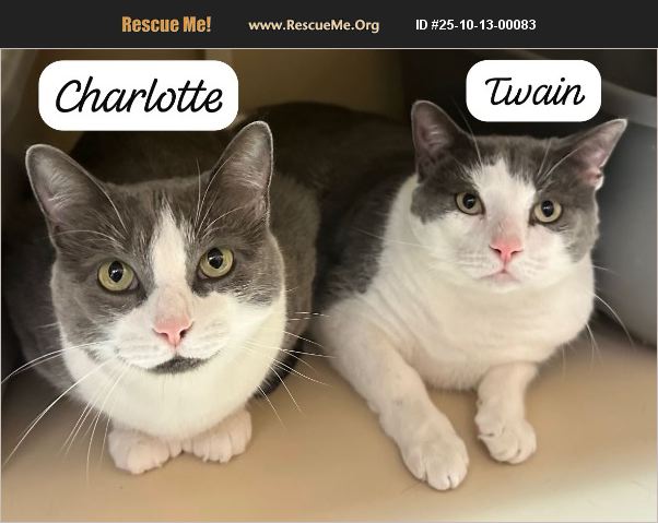 Charlotte and Twain are 5 year old bonded siblings looking for their forever home together. Charlette has a dark grey chin. They are super sweet and stick together at all times. They are fully vetted and ready for their forever home.
