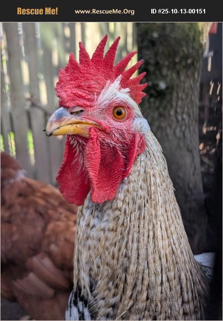 Whitey was supposed to be a chicken but has emerged as a rooster, which are illegal in the city of Seattle. He's a beautiful bird and is non-aggressive. He gets along with our chickens, dogs, and has been handled since he was a chick.
