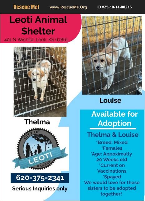 found as puppies in town. Vet checked and up to date on shots. They are also spayed. We are a small town, and we just want these sisters seen. They are being posted by the City of Leoti Animal Shelter. 620-375-2341