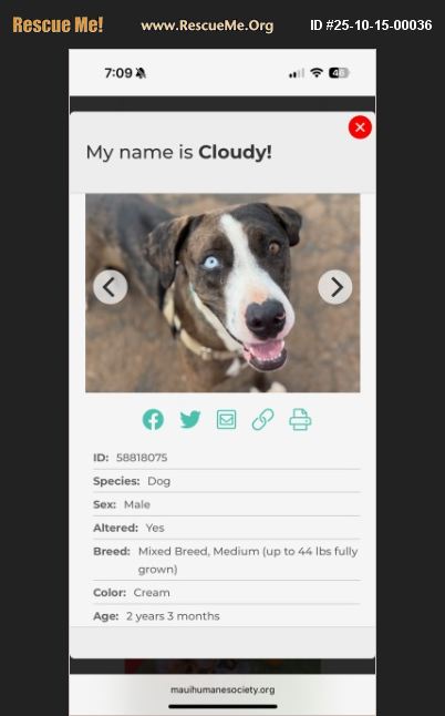 Transport from Hawaii can be arranged/sponsored. -Dog selective - has not been successful with other dogs yet and would ideally like to go to a home with Sunny -Best suited for an experienced owner -Recommended a mature household -Under socialized, flight risk and requires thoughtful introductions -Prey drive observed in shelter environment -Shows signs of fear, anxiety, or stress (FAS) in the kennel environment -Loves toys, gentle affection and his sister Sunny