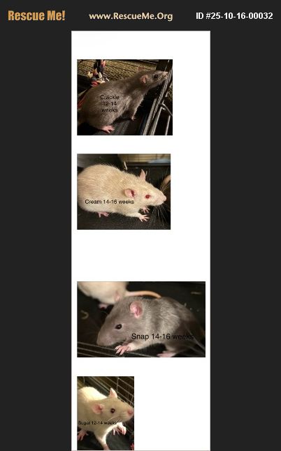 Hi, My name is Lula. My husband and I bought 4 girl rats in August, 2 white and 2 gray. Two of them are about 12 - 14 weeks old and the other two are about 14 -16 weeks. We just had them to the vet a few weeks ago and they are healthy. I need a good home for them. We just found out my husband is ill. I will have to take care of him and will not have time for the pet rats. I have them mostly liter trained. One is still very scared and she will nip. But the other ones are very friendly. Please email me. I would be so grateful is someone could take all 4, they get along very well. We live in south Jersey , Williamstown. Thank you!