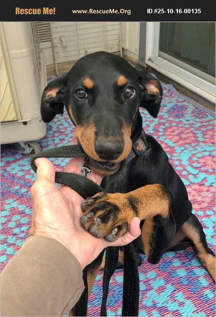 Urgent! This is a sweet, smart, beautiful, energetic and playful girl who loves everyone. She has a sleek gorgeous black coat and big, beautiful brown eyes. She is almost 5 months old and about 35lbs. She's housebroken, crate trained, loves to play ball fetch and heels pretty well along side a bicycle! She sits and waits to be told it's OK to eat her food. She's quiet in her crate, lets you sleep, loves to cuddle and loves kisses. She is full of energy but quiets down quickly. She was rescued from a less than ideal situation and we gave her good food, vaccines, and good care and will be a very special and loving family member. Dobermans are especially smart and her new family should experienced with the breed. Please email for more information!! She needs a home!!!
