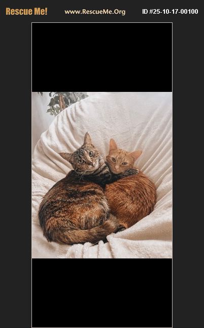 Hi there! I'm helping my parents rehome their two beloved cats, Goose and Maverick, because my parents can't care for them anymore, and I'm unable to keep them in my apartment. They are bonded and ideally should go to a home together. ��%90� About them (both 4 years old): Maverick - female, a little more reserved but extremely curious and cuddly. Loves exploring, hanging out on your lap, and following you around the house. Goose - typical orange cat, funny and energetic, loves being right on top of you, and brings lots of personality and joy to the home. Both are: �'ۢ Spayed �'ۢ Litter trained �'ۢ Good with other cats (after an adjustment period) �'ۢ Good with dogs (if dogs respect the cats' space and aren't overly playful) �'ۢ Great with all ages of people ��%8F� Rehoming goal: Looking for a loving, responsible home where they can stay together. A small rehoming fee ($25 each) applies to ensure they go to serious adopters.
