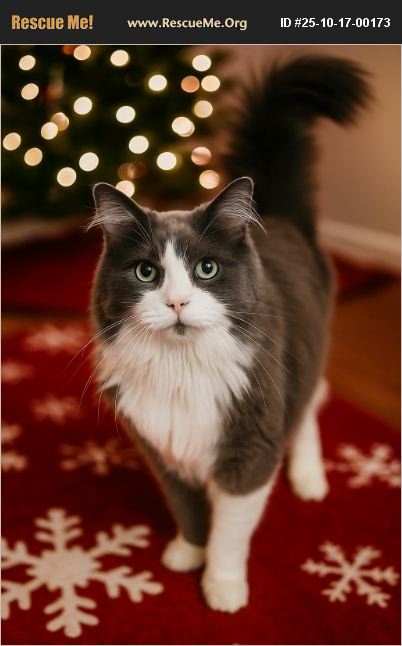 Okay are you seeing a theme here? Yeah my foster mom had a big Christmas themed adoption event at her house...No one showed up so here I am surrounded by a whole bunch of cats. I am fluffy and Oh so soft. I come when you shout my name in a loving way. I go to your room and let out a small meow until you invite me up on your bed. I snuggle and put and I love to play. I do have a eye that waters sometimes, but it is no big deal.