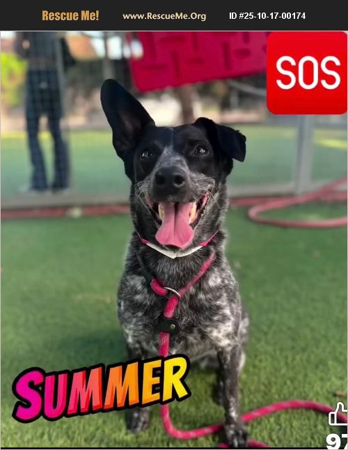 Urgent!!! this adorable little cattle dog girl is now going to be killed on 10/21 due to severe kennel stress!!! She must be saved by 10/20!!! please open your heart and your home to the sweet adorable girl!!! Videos: https://fb.watch/COoTwY6vhS/?mibextid=wwXIfr&fs=e https://fb.watch/COpapdQmlq/?mibextid=wwXIfr&fs=e DEATH DATE GIVEN OCT 21 at 8 am so she needs to be saved by 10/20!!! She was surrendered by her 'owner' in late Sept. because they 'had no time,' this 4 year old, 30 lb. pocket sized cattle dog must exit the shelter or she will be euthanized. Summer is very into people, and is good with other dogs as well. In playgroup she mingles around and is tolerant of other dogs. She has shared a kennel with other dogs as well. She recently went on an outing to test her herding capabilities. She rode well in the car and seems adjusted to a crate. She loved greeting all of the people and other dogs. While she didn't sustain interest in herding, she loved engaging and being stimulated. Out of the shelter, Summer is not fearful or intimidated, but she has been anxious in the shelter. It is being said the reason for euthanasia is severe kennel stress with her barking & running bs k and firth & jumping on kennel door but other staff members and all volunteers have observed she is wagging her tail and happy when we approach. Free group training is available for anyone who adopts, fosters or rescues a dog from the shelter through @larpbo. She is consistently great with people in the shelter and outside. Because she's not doing well at the shelter, she needs out now. She can be fostered or adopted or rescued. Please reach out to Lucy, our life saving liaison at 213-665-7614. You can also go to the shelter 14409 Vanowen St., Van Nuys, CA