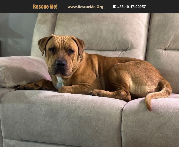 Meet Scoob! This young man is eager to please. When you're home, he loves to chill by your side. He enjoys being outside and does well with other dogs and cats. He does fairly well on a leash, but we have been working on daily. During the day while you're not at home, he prefers to just lounge around the house uncaged. He is not destructive, but has had some sort of trauma in the past where he refuses to be caged. He knows simple commands like sit, down, off. We have been working on leave it and stay. When we got him from a local shelter, we were under the impression we were fostering to adopt. We were sadly mistaking. We have had him for around 4 months now. Let me start by saying, he is a GREAT dog. The problem is we have 2 cocker spaniels, and they both are overly aggressive towards Scoob. We have contacted the rescue and they will not take him back as it has been too long. We continue to work with him daily. He would do well in a home with other dogs, just not smaller dogs. He loves to play and his size I think it part of the issue ours don't along with him. He is great with cats, as we have 2 as well. He has never shown any aggression towards our animals, kids, our guests. Not looking for a rehoming fee, but I do want to make sure he goes to a good home.