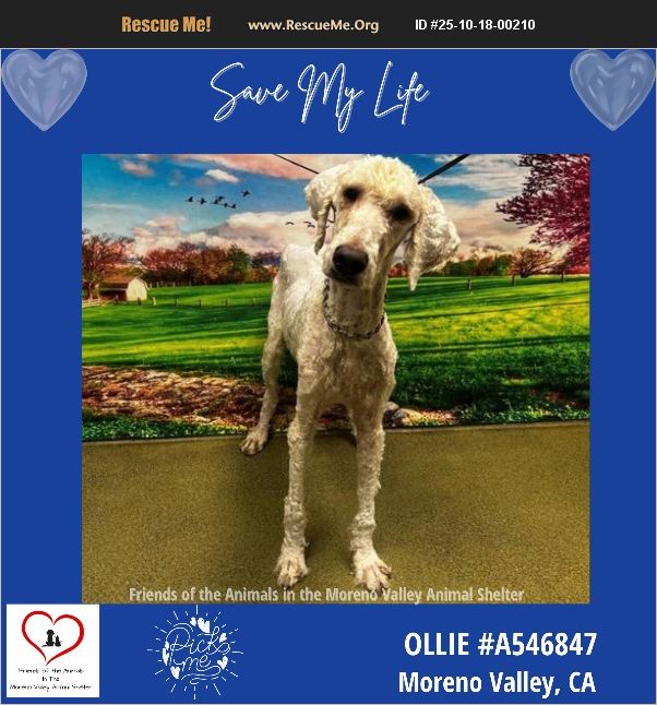 I am described as a male, white Poodle - Standard mix. The shelter thinks I am about 3 years old. I have been at the shelter since Oct 18, 2025 and I may be available for adoption on Oct 25, 2025 at 1:00PM