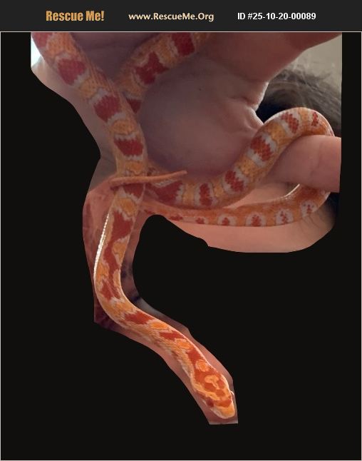 Beautiful and friendly orange albino corn snake named pumpkin. Was very tame but hasn't been regularly handled in awhile. With handling she is super chill. She is about 2 years old and ready for her forever home.