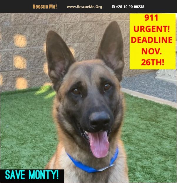 ** MONTY HAS BEEN GIVEN A 5 PM DEADLINE WEDNESDAY NOV. 26TH ** ******* Monty knows sit * Monty loves treats * Monty likes rolling in the grass ******************* MONTY ID#A546810 I am described as a male, fawn Belgian Malinois mix. The shelter thinks I am about 1 year. I have been at the shelter since Oct 17, 2025 and I may be available for adoption on Oct 24, 2025 at 1:00PM.