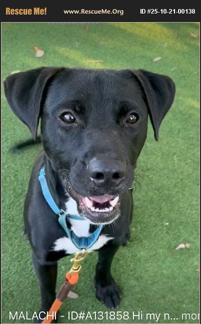 MALACHI - ID#A131858 Hi my name is MALACHI . I am just a young pup at 9 months old. I am such a sweet playful boy, and did I mention the cutest guy! I am the best fetcher ever! I love a good game of fetch and i will drop right at your feet sit and wait! Please don't let me grow up in the shelter come meet me and give me a chance! I am a neutered male, black and white lab mix. I weigh approximately 50 lbs