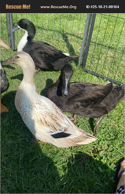I have 3 ducks that I need to find a new home for ASAP. We are not allowed to have ducks in the town we live in. These ducks are 4 months old. We have a Cayuga, Black Swedish, and Welsh Harlequin. The Black Swedish and Welsh Harlequin are definitely females, but we are unsure about the all black Cayuga.