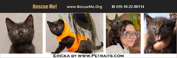Ericka is the purrfect 11-week-old black female kitten looking for a loving guardian. This magnificent, playful, sweet, and friendly kitten was found crying in some bushes on November 2nd struggling to breathe and survive on the south side of Chicago. Obviously, she was tossed out by some heartless human because she was already perfectly socialized. She was rushed to the vet and treated with three different antibiotics and two different eye meds over the course of a month. Shockingly (to me), she recovered without a trace of illness. We are thankful for our fosters Mandy and her daughter Eden, veterinarians, transporters and donors who have made this lifesaving rescue possible. Ericka will thrive in a home with another playful young cat. If you don't have one, we have other kittens available to pair her with. She is well-behaved in the home, uses her litter box perfectly, rides her foster mom's shoulder and just LOVES to play. Ericka is now very healthy, spayed, de-wormed, treated with revolution, up-to-date on age appropriate vaccines, virus-tested negative and microchipped. To meet and possibly adopt Ericka, please fill out an adoption application https://friendsofpetraits.com/cat-adoption-application/ After the application is complete, please contact [email protected] to schedule an appointment to meet her. Her adoption fee of $175 benefits the Friends of Petraits Rescue. She is being fostered in Chicago's Rogers Park neighborhood.