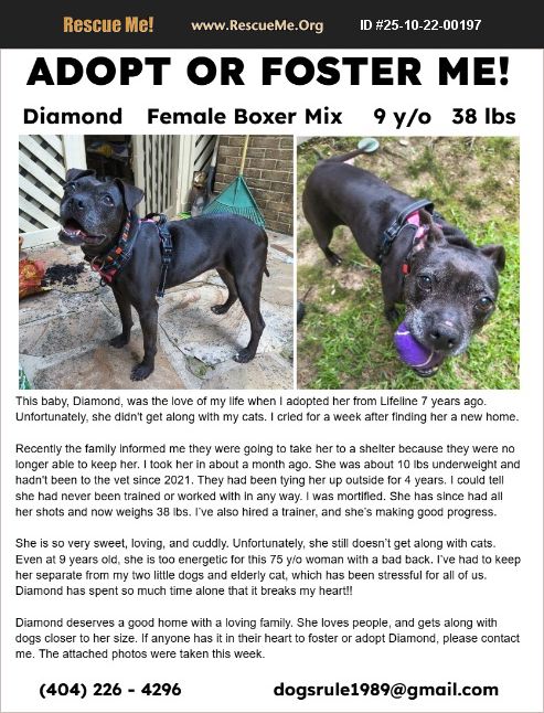 This baby, Diamond, was the love of my life when I adopted her from Lifeline 7 years ago. Unfortunately, she didn't get along with my cats. The family that I rehomed her with returned her to me about a month ago. She had been neglected and underfed. She has since had all her shots and now weighs 42 lbs. I've also hired a trainer, and she's making good progress. She is so very sweet, loving, and cuddly. Even at 9 years old, she is too energetic for this 75 y/o woman with a bad back. I've had to keep her separate from my two little dogs and elderly cat, which has been stressful for all of us. Diamond has spent so much time alone that it breaks my heart! Diamond deserves a good home. She loves people, and gets along with dogs closer to her size. If anyone has it in their heart to foster or adopt Diamond, please contact me. Diamond has had all her shots, microchipped, spayed and on heart worm preventative. I just recently had a full blood work up on her. She very, healthy and very energetic.