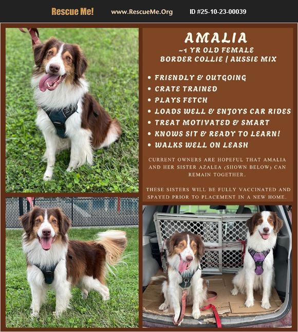 Sisters Amalia and Azalea are in search of a soft place to land. Amalia and Azalea, two sweet sisters, are in search of a loving place to call home. As puppies, they were abandoned in the woods by someone lacking compassion. Fortunately, a caring elderly couple found them just in time and provided them with the love and care they desperately needed over the past year. Sadly, the couple is now facing serious medical challenges, which have led them to seek a new home for these lovely sisters. We are actively reaching out to local herding breed groups to find someone willing to offer them a lifelong commitment. We believe they may be Border Collie and Australian Shepherd mixes. About the Sisters Amalia is the more outgoing sister, while Azalea tends to follow her lead. Both are gentle and friendly. These sisters enjoy playing, chasing toys, and running freely in their fenced yard. They walk well on a leash together, although their owners have mentioned they can be a bit strong at times. During our evaluation, we found that both girls are highly treat-motivated and walked gently beside us, focused on the treats! They have already learned to 'sit' with enthusiasm, accepting treats ever so gently. When their owners have medical appointments, the sisters are crated, which is also where they eat their home-cooked meals. We observed that, given their activity level and age, their calorie intake should be increased to help them gain a little weight. They showed curiosity but remained calm when introduced to our 'test' dogs (one small breed and one large breed) on a leash, walking alongside them effortlessly without any prey drive noted. We did not evaluate them off-leash. Amalia and Azalea love car rides and load and unload with ease. We can envision them as perfect partners for outdoor activities and potentially training for canine sports like agility, dock diving, and more! The owners estimate they are under a year old, meaning they have a bright future ahead. While it is not essential for them to be rehomed together, their owners hope this will be the case, as Azalea relies on Amalia for confidence in new situations. If they must be separated, Azalea will need to be placed with another confident dog. The decision to find a new home for these sisters has undoubtedly been difficult for their current owners, who love them dearly. The bond formed after rescuing them from the woods that day was palpable to us during our visit. How You Can Help We kindly ask you to share their story and photos with anyone you know. Experience with herding breeds is a plus but not required. They would do best in a home which understands their need to keep their minds and bodies engaged with stimulating activities. Of course, above all. love care and compassion are the most important of all! Amalia and Azalea are up to date on all vaccinations and will be spayed the week of October 27th 2025. They currently reside in the Clark County, Virginia area. We will assist with transportation of up to 4 hours from this location and even farther if placement is found in the North Carolina region. Thank you for taking the time to read about Amalia and Azalea. Please reach out if you have questions or are interested in adopting one or both of these sisters.