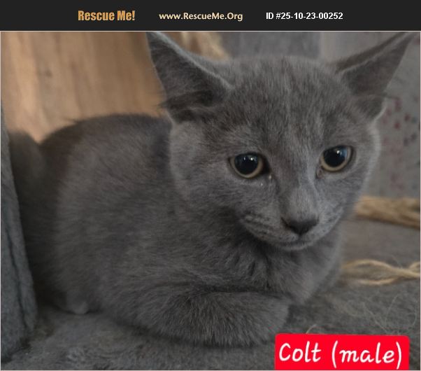 Colt was born outside and was rescued with his siblings at about 5 weeks old. He was the first of his litter to decide people are ok. He's still timid at first, but then he will curl up in your arms and go to sleep.