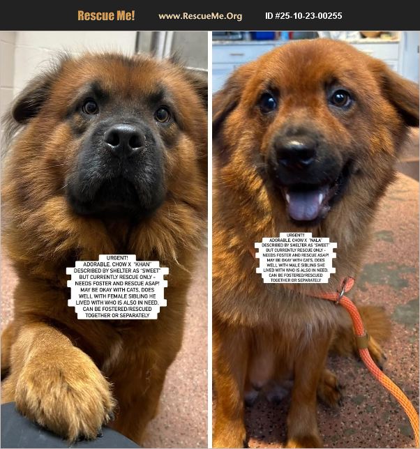 Courtesy Posting: URGENT AT NEW ALBANY ANIMAL CONTROL- ADORABLE, CHOW X SIBLINGS 'KHAN' AND 'NALA' DESCRIBED BY SHELTER AS 'SWEET' but Currently RESCUE ONLY - NEEDS FOSTER AND RESCUE ASAP! May be okay with cats, does well with with one another, and can be fostered and or rescued together or separately. Help! The shelter is asking for help for Khan and his sister/friend Nala who are both said to be 3 years old. They are a pair of siblings that were surrendered together after their human dad was in a bad spot and decided for the good of him and the dogs to surrender them, as he could no longer afford to care for a pet. The shelter tells us they are sweet to people when given the chance, but like many chows, nervous at first. We understand they also lived in a home with cats and other dogs. The shelter has stated, 'While I think they would be fine together and would love to see them both go it is defiantly not a requirement that they stay together. They are currently in the same room and can see each other but are housed in separate kennels'. 'Khan is the more confident goofy one. He's 61.4 lbs and full of personality. His coat was in rough shape, but he let me brush a good amount of it out today, so he is looking better. I would personally call him housebroken; he hates pottying in his kennel, but sometimes has to overnight. He potties outside like a good boy every time we go on his walks. He loves people and does want to jump up and hug you, something we are working on since he is a big dog. He really just wants to be held despite his size. We did try and introduce him to other dogs however he is terrified of them. He never showed any signs of aggression, but he did run away from them, even the small yorkie mix we tried to have him meet.' As an update, they later said, 'Khan was introduced to a small Pit mix (Spayed female) and did ok!' Despite this, he is still Rescue only at this time. 'Nala is the more reserved one. She is 44.2 lbs. She defiantly finds comfort in people, but is nervous about receiving that love. She likes a gentle pet and lots of treats. She's very food motivated. We have seen no signs of food aggression. She has had 3 litters that we know of, litters we believe where fathered by her brother Khan as the other male in the house was fixed. She has had less handling so far than her brother and does improve daily, but is just not as outgoing as him. She finds lots of comfort in her kennel and is excited to go back to it when we are done being social. We struggle to walk her outside, she is incredibly nervous, not made better with the loud noise as we are located right next to an interstate. She is mostly fine walking through the building, nervous, but goes with some gentle coaxing. Monday, it was noticed that one of her eyes has become cloudy. One of our vets took a look at it and we will be starting her on some medications when they come in.' As an update, Nala's eye has gotten worse, and a decision has been made by the shelter vet to remove the one eye to relieve her pain so she hopefully will feel much better. 'They had no issues handling for vaccines or for vet checks. They don't love it, but they let it happen with no complaints. They have been vaccinated (DAPP w/ Lepto + Bordetella + Dewormer + Bravetco) but have not received their booster round yet. They have NOT yet been altered/heartworm tested, but that is something we are willing to do with rescue commitment. They do not have stray holds as they were surrendered to us. They are not currently adoptable as we have been unable to assess them with other dogs, something that we do require. They are not currently on a deadline, however if they start to degrade in their kennels in any way that may change.' 'Rescue only' means only a rescue group can pull them out of the shelter (they cannot be adopted directly from the shelter at this time, so you need to go through a rescue group) to save either or both. However, rescues need fosters and a place for a dog to go. Therefore, if you are interested to foster or foster to adopt either dog or both, please contact [email protected] asap or Southern California Chow Chow Rescue Network who is trying to assist the shelter with their placement. Please notes rescue groups typically need a foster to save a dog. We will to pair you with a willing rescue group in time. If you have any other questions, the shelter is also happy to answer and told us, please have anyone interested reach out to Spencer Shelton at [email protected] and or by calling (812) 948-5355. We will be posting additional pictures and video of both dogs on facebook: Khan's facebook post is: https://m.facebook.com/story.php?story_fbid=10167948703668125&id=783968124&mibextid=wwXIfr Nala's facebook post is: https://www.facebook.com/debbie.alder.14/posts/10167948748253125 Joint facebook post is: https://www.facebook.com/debbie.alder.14/posts/10167948769923125 Note: to view content