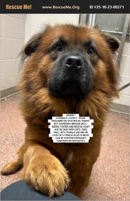 Courtesy Posting: NEW ALBANY, INDIANA- URGENT AT NEW ALBANY ANIMAL CONTROL- ADORABLE, CHOW X 'KHAN' ID #A0059252011 DESCRIBED BY SHELTER AS 'SWEET' but Currently RESCUE ONLY - NEEDS FOSTER AND RESCUE ASAP! May be okay with cats, does well with female sibling he lived with who is also in need, can be fostered/rescued together or separately Help! The shelter is asking for help for Khan and his sister/friend Nala who are both said to be 3 years old. They are a pair of siblings that were surrendered together after their human dad was in a bad spot and decided for the good of him and the dogs to surrender them, as he could no longer afford to care for a pet. The shelter tells us they are sweet to people when given the chance, but like many chows, nervous at first. We understand they also lived in a home with cats and other dogs. The shelter has stated, 'While I think they would be fine together and would love to see them both go it is defiantly not a requirement that they stay together. They are currently in the same room and can see each other but are housed in separate kennels'. 'Khan is the more confident goofy one. He's 61.4 lbs and full of personality. His coat was in rough shape, but he let me brush a good amount of it out today, so he is looking better. I would personally call him housebroken; he hates pottying in his kennel, but sometimes has to overnight. He potties outside like a good boy every time we go on his walks. He loves people and does want to jump up and hug you, something we are working on since he is a big dog. He really just wants to be held despite his size. We did try and introduce him to other dogs however he is terrified of them. He never showed any signs of aggression, but he did run away from them, even the small yorkie mix we tried to have him meet.' As an update, they later said, 'Khan was introduced to a small Pit mix (Spayed female) and did ok!' Despite this, he is still Rescue only at this time. 'Nala is the more reserved one. She is 44.2 lbs. She defiantly finds comfort in people, but is nervous about receiving that love. She likes a gentle pet and lots of treats. She's very food motivated. We have seen no signs of food aggression. She has had 3 litters that we know of, litters we believe where fathered by her brother Khan as the other male in the house was fixed. She has had less handling so far than her brother and does improve daily, but is just not as outgoing as him. She finds lots of comfort in her kennel and is excited to go back to it when we are done being social. We struggle to walk her outside, she is incredibly nervous, not made better with the loud noise as we are located right next to an interstate. She is mostly fine walking through the building, nervous, but goes with some gentle coaxing. Monday, it was noticed that one of her eyes has become cloudy. One of our vets took a look at it and we will be starting her on some medications when they come in.' As an update, Nala's eye has gotten worse, and a decision has been made by the shelter vet to remove the one eye to relieve her pain so she hopefully will feel much better. 'They had no issues handling for vaccines or for vet checks. They don't love it, but they let it happen with no complaints. They have been vaccinated (DAPP w/ Lepto + Bordetella + Dewormer + Bravetco) but have not received their booster round yet. They have NOT yet been altered/heartworm tested, but that is something we are willing to do with rescue commitment. They do not have stray holds as they were surrendered to us. They are not currently adoptable as we have been unable to assess them with other dogs, something that we do require. They are not currently on a deadline, however if they start to degrade in their kennels in any way that may change.' 'Rescue only' means only a rescue group can pull them out of the shelter (they cannot be adopted directly from the shelter at this time, so you need to go through a rescue group) to save either or both. However, rescues need fosters and a place for a dog to go. Therefore, if you are interested to foster or foster to adopt either dog or both, please contact [email protected] asap or Southern California Chow Chow Rescue Network who is trying to assist the shelter with their placement. Please notes rescue groups typically need a foster to save a dog. We will to pair you with a willing rescue group in time. If you have any other questions, the shelter is also happy to answer and told us, please have anyone interested reach out to Spencer Shelton at [email protected] and or by calling (812) 948-5355. We will be posting additional pictures and video of both dogs on facebook: Khan's facebook post is: https://m.facebook.com/story.php?story_fbid=10167948703668125&id=783968124&mibextid=wwXIfr Nala's facebook post is: https://www.facebook.com/debbie.alder.14/posts/10167948748253125 Note: copy and paste each link into browser to view content