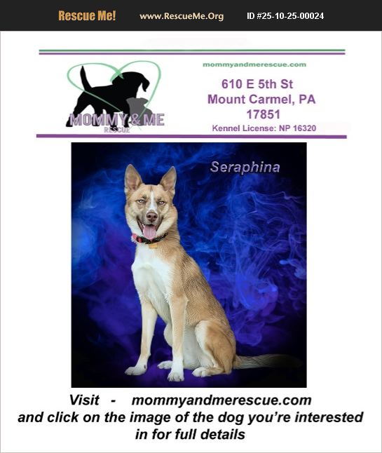 Please fill out an application here ) https://mommyandmerescue.com/adoption-application/ and give your vet clinic permission to speak with us. Spayed/Neutered, UTD on vaccines, Chipped Adoption fee 400 You must submit the application and be approved prior to meeting one of our dogs. Please add our EMAIL to your contacts! [email protected] Kennel License: NP 16320 Seraphina Husky/Shepherd mix 1 �%BD years old Weight: 36 pounds Seraphina has been let down by humans several times. Seraphina is excited about life and likes to share that excitement with everyone. Seraphina loves other dogs and kids. Seraphina is house-trained and crate-trained. She loves playing, going for walks, and would love hiking or jogging with her person/s. Seraphina does climb fences so she either needs a very secure yard (privacy fence) or someone who goes out to potty with her on lead. She may outgrow this with time and training. Seraphina is sweet and affectionate and like all huskies, she is vocal. Seraphina was trained at FIDOS SCI Coal Township and knows the following: Heel Kennel Sit Wait Down Come Sit Pretty Bang Spin