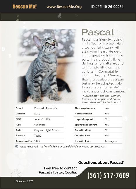 Meet Pascal! Pascal is at the PetSupermarket in Boynton Beach at 4762 N Congress Ave, Boynton Beach, FL 33426. He will be there until November 9 or until he's adopted. If interested in meeting him, please feel free to go there and see him!