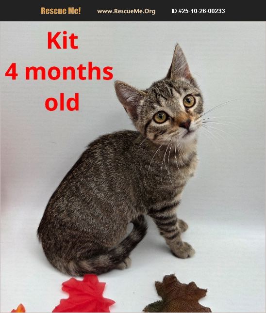 Meet Kit! Kit is Mott's equally adorable twin sister - a 14-week-old tabby sweetheart with the same playful sparkle in her eyes! She's curious, confident, and full of kitten mischief. Kit loves to chase toys, wrestle with her sister, and climb to the highest perch just to show off her brave side. When the fun is over, she's all about cozy snuggles and gentle purrs. Kit is wonderful with dogs, cats, and kids, and she's fully litter box trained. She has been spayed, vaccinated, dewormed, tested FIV/FeLV negative, and microchipped. Her adoption fee is $125.