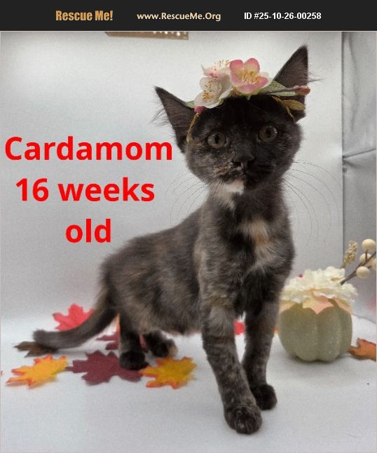 Meet Cardamom! Cardamom is Saffron's beautiful tortoiseshell sister - a 16-week-old sweetheart with a gentle spirit. She can be a bit shy at first, but once she knows you're kind, she blossoms into the sweetest little cuddle bug. Cardamom loves gentle pets, quiet playtime, and cozy naps near her favorite people. She's fully litter box trained and does well with cats, dogs, and kids. Cardamom has been spayed, vaccinated, dewormed, tested FIV/FeLV negative, and microchipped. Her adoption fee is $125.