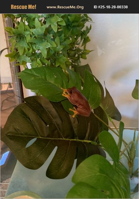 Burgundy Morph. Approximately 2-2.5 years of age. Includes 18x18x24 front opening terrarium, pool, hanging pool, fake plants, x2 small hanging rooks, Also rehoming x2 White's Tree Frogs, and a banded bullfrog. Must show prior frog keeping experience.