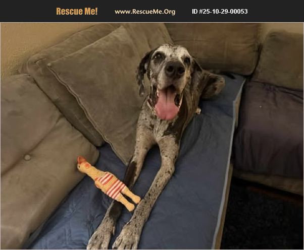 LOCATION: Dallas, TX DOB: 05/25/2023 Meet Bambi, a beautiful merle Great Dane with a big heart once you earn her trust. She can be a little cautious at first, especially with new people, but once she feels safe, her sweet and goofy personality shines through. It only takes some time and patience before she's ready to curl up across your lap, doze off by your side, or settle on the couch gazing out the window. She'll happily alert you to visitors or passersby, but otherwise she's a calm and easy companion around the house. Bambi is very food motivated, which makes training fun-she'll often race ahead and sit before you've even given a cue, just to earn her reward. Bread is her all-time favorite treat (she acts like it's a five-star steak dinner!), and she's got impressive skills when it comes to catching treats midair. She also adores her walks and is overjoyed when she sees the leash come out, though one good walk a day is plenty for her. After that, she's content to nap or lounge. She's got some adorable quirks too-whether it's resting her head dramatically over the armrest of the couch, riding along as your 'backseat driver' in the car, or proudly carrying around her two favorite toys: a squeaky plush puppy and a rubber chicken. She plays gently with them and doesn't try to tear them apart, which makes her even more endearing. Bambi is crate-trained, housetrained, walks well on a leash after the first few minutes of excitement, and rides beautifully in the car. She has also been muzzle-trained and will slip her head right in if she knows a hot dog is waiting at the end. The one thing she struggles with is nail trims-especially her front feet-so her future family will need patience and maybe some creative desensitization to help her through that challenge. She gets along fine with other dogs on walks, but in the home she would truly thrive as the only pet where she can soak up all the love and attention. She has done well around her foster's teenage son and his friends, but she would be best suited for a home with adults or older kids rather than small children. She's also shown no prey drive toward cats or squirrels, though she'll chase if one dares run along the fence line. Bambi's ideal home would be with a couple or family who are around often, patient enough to let her settle in at her own pace, and kind enough to continue building her trust. In return, you'll be rewarded with a loyal, gentle companion who will make you laugh with her quirks, warm your lap with her cuddles, and brighten your days with her sweet, soulful presence. ========================= To apply to adopt me, please fill out the application form! https://form.jotform.com/51994996709176 . Note: SRGDRR adopts nationwide and offers transport options to help you find your perfect match! Check out our other adoptable dogs at saverockythegreatdane.org/adopt.