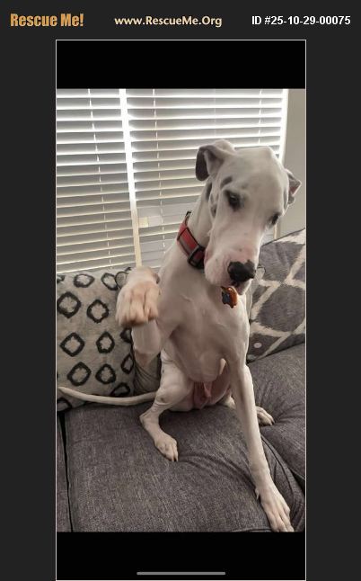 LOCATION: Mooresville, NC DOB: 06/07/2021 Meet Broley, a handsome white Great Dane with a goofy streak and a gentle, thoughtful soul. At his core, he's a big clown who loves nothing more than simply being near his person. Once he knows he can trust you, his sweet, easygoing personality shines through, and he'll happily spend his days lounging, following you around the house, or curling up for long naps at your side. Broley has definite couch-potato tendencies and thinks a comfy spot and a calm home are just about perfect. He's a champion napper, an enthusiastic snuggler, and he'll gladly share the couch-especially if you got there first or have a treat to sweeten the deal. Out in the yard, he's content with a bit of exploring and light play, but he doesn't need high-energy adventures to be happy. A fenced yard where he can relax and move at his own pace suits him well. He's still learning that new people can be safe and kind, so he may be wary at first and sometimes reacts when faced with unfamiliar adults. But with patient, gentle handling, he's making steady progress. He's smart, observant, and slowly discovering how to play, and he appreciates someone who will go at his pace and show him the world doesn't have to be scary. Broley is fully housetrained and walks nicely on a leash. He does best having his own room instead of a crate, where he can stretch out and feel secure. He's muzzle trained, too, which makes vet visits and new situations easier for him. He recently completed heartworm treatment, and his future adopter should follow up with their vet to confirm his status. He hasn't yet been introduced to other dogs, cats, or children in his foster home, so a careful, structured introduction plan would be needed if those are part of his future family. He does have a mischievous side-Broley is a proud countersurfer and has a particular fondness for apples, mangos, and bread. With consistency and supervision, he's learning the rules, but his new family should expect a bit of creativity and persistence from this smart guy. Broley's ideal home is quiet, patient, and understanding. He'll thrive with someone who appreciates the Dane 'lean,' doesn't mind a little dog hair, and is willing to give him the time he needs to build trust. A fenced yard would give him a safe space to relax, and a home with kind adults who come around regularly would help him continue his progress with meeting new people. With the right family, Broley will blossom into a loyal, affectionate companion who brings equal parts silliness and sweetness to every day. ========================= To apply to adopt me, please fill out the application form! https://form.jotform.com/51994996709176 . Note: SRGDRR adopts nationwide and offers transport options to help you find your perfect match! Check out our other adoptable dogs at saverockythegreatdane.org/adopt.