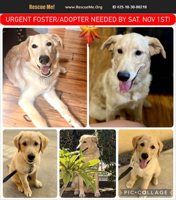 Cooper Needs a Miracle! Time Is Running Out: November 1st! Sweet Cooper is a 6-month-old Golden Retriever puppy who's as loving, goofy, and full of life as they come. He's great with other dogs, adores people, and has that classic Golden personality that melts hearts wherever he goes. But Cooper's world is about to change forever. His family has to move and can't take him. If we don't find him a safe place by Saturday (Nov. 1st), he'll be taken to a kill shelter. Please, help us save him. Cooper deserves to grow up surrounded by love, not fear. If you can foster, foster-to-adopt, or adopt, please reach out to Jennifer with Pumpkin Pawz Rescue at (714) 366-8170 (text is best). Time is ticking. Even if you can't take him, please share his story. It truly takes a village to save a life. Note: his puppy pictures are included.