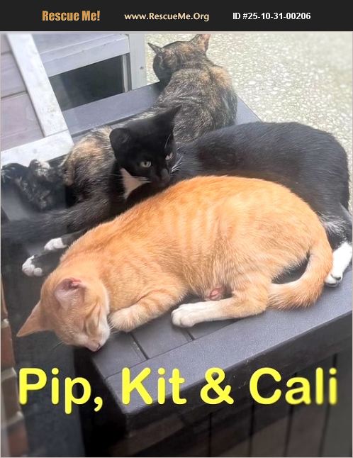 These three sweethearts were born in mid-April of this year, to a very feral momma who I finally managed to catch and get spayed after four long years of trying. Every one of them has come so far since then, they've learned to trust, to play, and to love a good meal twice a day. ��%BD�� Meet the trio: Pip (M) - Orange and white tabby, my shoulder buddy and little shadow. He's gentle, affectionate, and dreams of being an indoor kitty. Kit (F) - A curious spirit who loves to explore and would do great as an indoor/outdoor cat. Cali (F) - A gorgeous tortoiseshell-point calico with a brave streak and a soft side once she warms up. They're all healthy, friendly, and ready for homes where they'll be loved and safe. I've cared for them since they were about 2 months, but after losing my job, I can't keep up with their needs the way they deserve. It breaks my heart to think of them not finding families of their own. Please....if you're in or near Jacksonville, FL, and can open your home (or even foster), reach out. I don't want to surrender them to animal control, they've come too far for that. ��%BD��%BD%90��%BD They just need a chance, and someone to see how special they are.