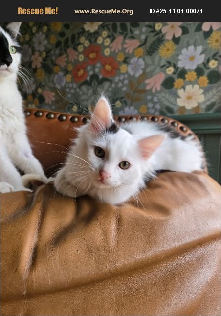 Cow Meow is an adorable, three-month-old kitten, with a social and playful personality. He loves to cuddle, play with his mom, and make biscuits. Cow Meow loves a scratching post and small toys that he can bat around. He spends his days loose in the house with his mom and several dogs. He also lives with a human toddler. Cow Meow has thrived in this situation and he appears to have no difficulty adjusting to all sorts of living companions! He is litter boxed trained. Cow Meow has not seen a veterinarian yet in his young life, so will need to start regular care and his vaccine schedule upon arrival in his new home. He is unneutered. Cow Meow has been recently medicated for fleas. Cow Meow doesn't have any 'special needs,' per se, but it would be lovely if he could find a home to go to with his mom (Bizzy, listed separately). They love being together and are very sweet to watch.
