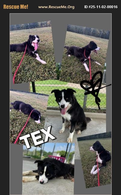TEX is a stunning Corder Collie. 19 months and 52 lbs as of 11/1/25. He was a stray picked up by animal control. He walks well on a leash. Loves toys and treats. He loves to play fetch with a ball. He loves all dogs. He's good with my cats outside. Very smart. With the right person he could do agility. He does not need to be kenneled all day. He needs someone who is at home and can give him exercise. He's not destructive.... He knows sit. Working on stay. TEX is currently located in Ripley, TN. Please contact Lisa at [email protected] or 731-499-0739 . Transport out of state can be arranged for an additional cost of $185 ... which will include is health cert for travel.