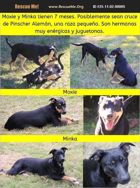Moxie y Minka son hermanas. Han estado juntas durante sus siete meses de vida. Suelen dormir juntas por la noche. Son cari��osas y muy en��rgicas. Juegan mucho juntas. Son de raza peque��a, posiblemente cruce de Pinscher Alem��%BD��%BDn. Corren muy r��%BD��%BDpido y son buenas cazando ratones y ratas. Viven en el exterior, en casetas para perros. Gozan de buena salud. Buscamos un nuevo hogar para ellas porque tenemos un jard��%BD��%BDn grande que requiere perros grandes. Moxie y Minka son perras muy dulces y buenas que necesitan a alguien que las quiera. Si te gustan los perros peque��os, te enamorar��%BD��%BDs de estas adorables hermanas.