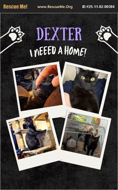 Dexter is approximately 1.5 years old and is an indoor only cat. He is mostly black with a small white spot on his chest. While not overweight, Dexter is a big, friendly goofball and loves to run around and play. He has a great deal of energy, and love to give his forever human, with lots of kisses and nose. I'm middle age and he's a bit more than I can handle these days - such a big boy! Tho is what is prompting the need to rehome. This rehoming is heartbreaking for me, but I know he will do great in a situation where he has room to jump around and play.