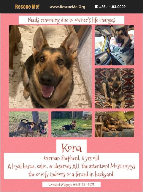 Kona is a sweetheart. She's now 6 years old. She loves the outdoors & indoors. Love to Velcro by your side, giving & receiving attention. Pretty calm & chill, but protective when needs to be. Very smart & loyal :)