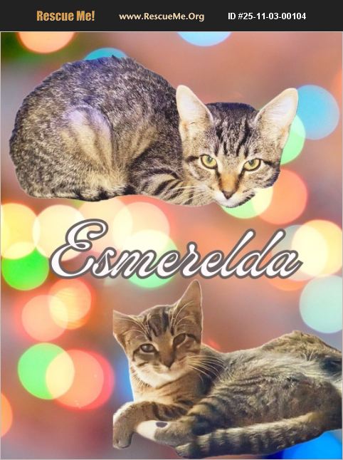 Meet Esmeralda! Foster home in Monmouth County, NJ This brown tabby beauty is as divalicious as her name suggests! At just around 10 weeks old, Esmeralda is ready to share her sparkle with her forever family. Esmeralda loves other cats and currently lives in a foster home with a big dog. When she's not gazing out the window daydreaming about her next adventure, she's chasing her cat toys and showing off her playful side. Whether you're looking for a cuddly companion or a spunky playmate, Esmeralda will be the purrfect addition to your family.