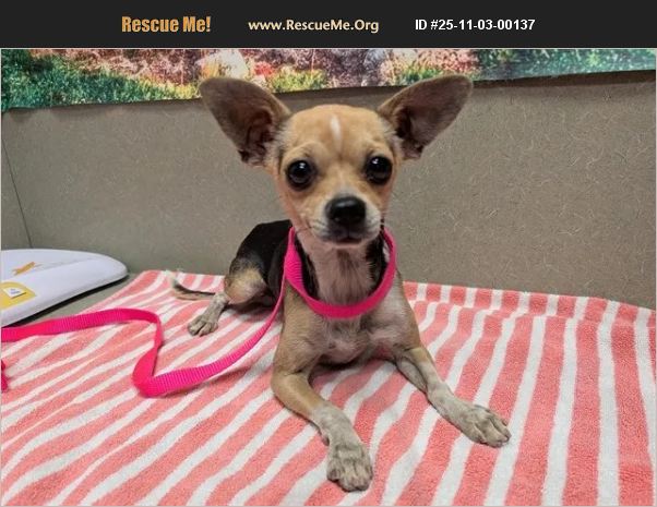 ID#A547091 I am described as a male, tricolor Chihuahua - Smooth Coated mix. The shelter thinks I am about 5 years old. I weigh approximately 6.80 lbs. I have been at the shelter since Oct 29, 2025 and I may be available for adoption on Nov 06, 2025 at 10:00AM.