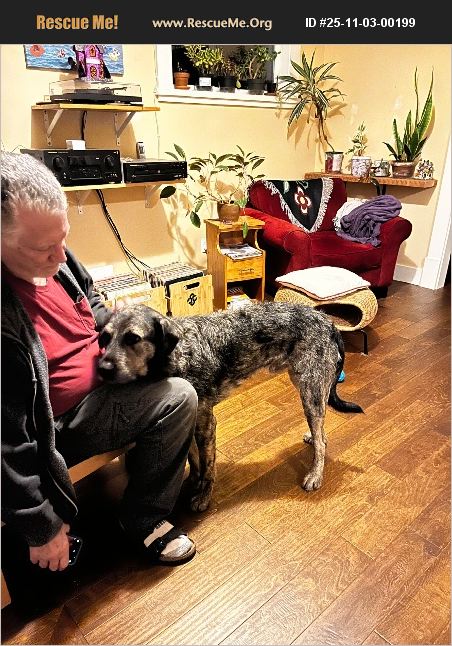 The sweet dog catahoula leopard dog/Bouvier de Flandres. He's two years old, we fostered him out of our daughter's house because the other dogs were too aggressive. my husband and I are in our 70s and although he's sweet tempered, he's too big of a dog for us. Plus I have allergies. We want someone who is kind to animals and has a nice outdoor space. He deserves it. He has minor hip dysplasia and just takes vitamins for it. He has some anxiety and fear from living with his previous family and the more aggressive dogs, but since we've had him, he has much less so.