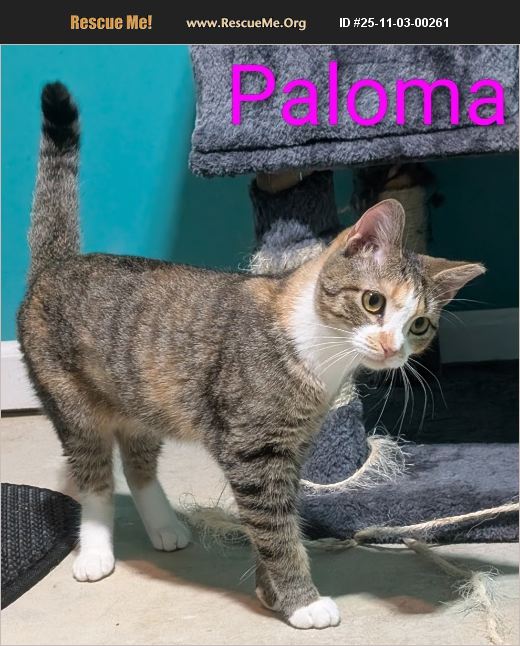 Paloma is a small, round faced, and relatively shy kitty. It will take a little longer for her to settle in comfortably with new people, but she's affectionate once she trusts you. She also enjoys toys. DOWNSIDE? She has a permanent head tilt. When her litter was young, they came to us with mycoplasma, an aggressive bacterial upper respiratory infection. She was the hardest one hit by it, and it has left permanent damage to her inner ear, causing a shift in her equilibrium. To her, it feels like the world is sideways. This does not prevent her from normal cat behaviors; she still plays, uses the litterbox, climbs the cat tree, etc... When you pick her up or put her down, she prefers being hugged close and feeling supported, so she can relax and not worry about falling. Some think the head tilt gives her a curious charm; do you? Adoption Fee is an optional donation. We help cats out of our own home, but due to health problems, need to take a break from rescuing and reduce the workload at home for a while.