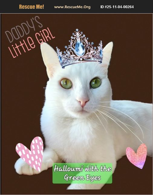 Halloumi is a major daddy's girl. She is a little bit of a spicy diva, but she loves attention and loves getting her special wet food on the counter, away from the other kitties in our rescue. We are hoping to see her in a home where she is truly the princess!